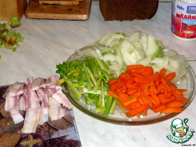 • Пока обжаривается мясо, все овощи режем соломкой, хлеб - кубиками. Шпик нарезаем на тонкие ломтики.