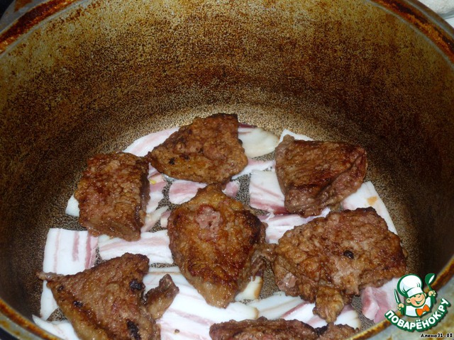• На дно казана (сотейника, горшочков) выкладываем шпик, куски мяса.
