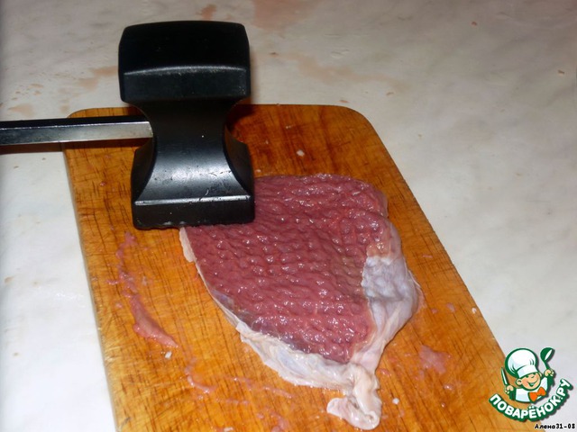 • Мясо нарезаем порционными кусками и слегка отбиваем (если не уверены в молодости буренки).