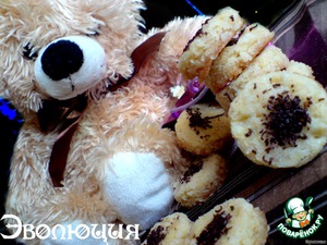 У меня еще обнаружился маленький кусочек забытой всеми шоколадки. Я натерла ее в стружку и по чуточке присыпала еще теплое печенье. Стружка великолепно прилипла к печенью:-)
