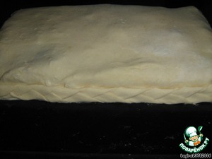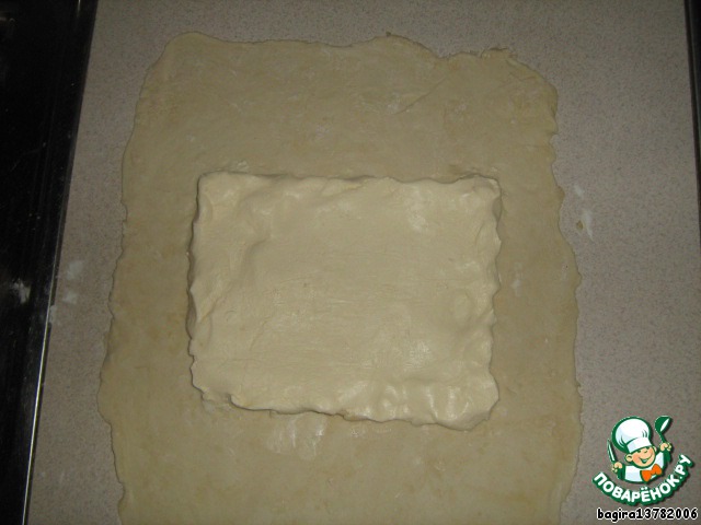 Тесто раскатываем в пласт толщиной 3-4 мм на присыпанной мукой поверхности. Кладем в центр теста масло, которое должно быть меньше теста по размеру в два раза.