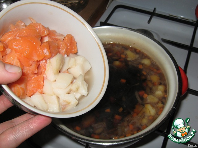 Готовим рыбу. Очень желательно, чтобы в супе было два вида рыбы: белая и красная (у меня обычно это сёмга и эскалар), можно ещё какую-нибудь рыбу добавить, но обязательно благородных сортов. Рыбу берём, приблизительно, в равных пропорциях, режем кусочками.