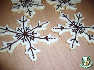 Готовое печенье разделить на две части, на тех, которые поменьше, нарисовать снежинки расплавленным шоколадом.
