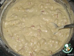 Яйца взбить с солью и перцем, влить молоко и добавить размягченное сливочное масло, перемешать, всыпать просеянную муку и соду, замесить тягучее тесто, добавить сыр и ветчину, размешать. -