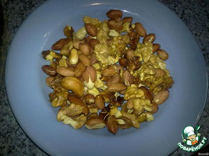 • Орехи любые (у меня были арахис, грецкие, фундук, миндаль и кешью) - стакан, поджарить (я это сделала в микроволновке, в течен. 2 мин).