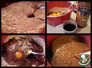 Добавляем к шоколаду все сухие компоненты: сахар, крахмал, миндаль, муку, какао, соль, разрыхлитель и соду (это не ошибка, содового привкуса не будет!). Перемешали.