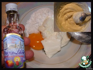 Сначала сделаем начинку: творог, 1 желток, 1 ст.л. сахара, 2 ч.л. крахмала и ликер (апельсинового у меня не оказалось, взяла инжирный) - все смешаем до однородной массы. -