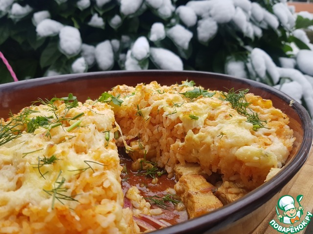 Готовое мясо выкладываем по порциям в горшочки (или в одну любую глубокую форму), смазываем майонезом, на мясо выкладываем рис, посыпаем приправой для риса, смазываем майонезом, натираем сыр на терке и посыпаем наш рис.
