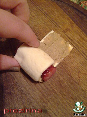Пластинку теста смазать паштетом и, положив на край колбаску, завернуть трубочкой.