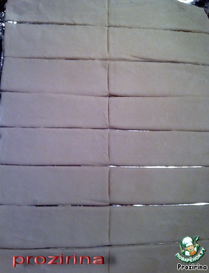 Пласт теста тонко раскатать и разрезать на 16 кусочков.