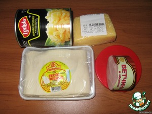 Готовим начинку: ветчину порежeм маленькими квадратиками, ананасы, в данном случае, уже порезаны дольками (но я люблю, когда все продукты мелко порезаны, поэтому ананасовые дольки измельчаю на более маленькие кусочки). Сыр натереть на мелкой терке.