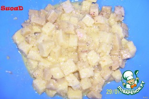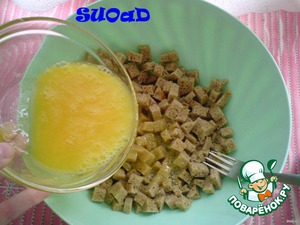 Вливаем взбитые яйца и перемешиваем, чтоб все кусочки пропитались в яйце, оставляем на 20 минут.