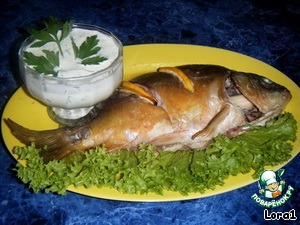 Выложить карпа на блюдо , украсить листьями салата и подавать с соусом.