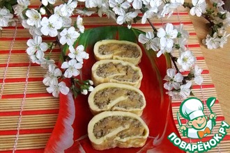 Затем скручиваем в рулет, нарезаем ,обмакиваем в муке, во взбитом яйце и жарим.