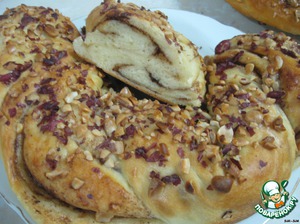 • Завитый жгутом рулет уложить на смазанный маслом противень и придать форму подковы. Поставить на расстойку мин на 20 (если есть время), смазать яйцом, обсыпать рублеными орехами и поставить в разогретую до 180* духовку минут на 40... Первые 15 минут духовку не открывать! Проверяете готовность спичкой...