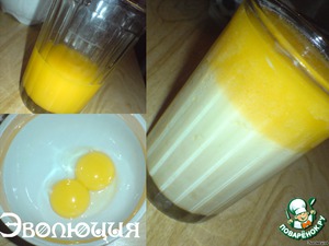 Масло следует растопить и вылить в стакан (250мл). Если оно слишком горячее – немного остудить. В масло добавить взболтанные желтки. Долить в стакан чуть подогретое молоко. Молока нужно столько, чтоб стакан с маслом и желтками заполнился до края.