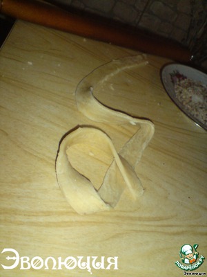 От теста отрываем кусочек, раскатываем его в длинный жгутик. Жгутик раскатываем скалкой в полоску. Ежели хочется, то аккуратненько обрезаем неровные края полоски теста ножом. В принципе можно было раскатать тесто в один- два пласта и нарезать полосками:-)
