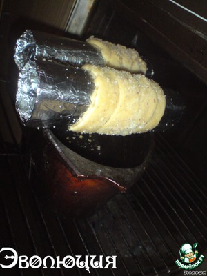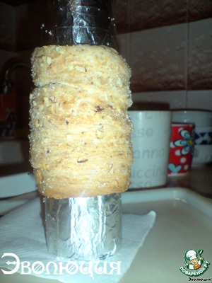 Далее полоску теста обматываем по спирали внахлест вокруг нашего фольгового цилиндра. Внахлест примерно 5мм. Кончики теста прячем под соседний виток :-)