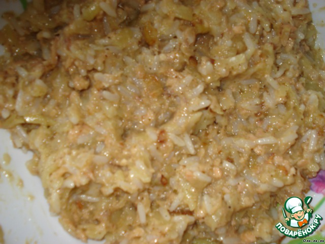 Лук обжарить до прозрачности, остудить, добавить к основным ингредиентам. Туда же отправляем и вареный рис.