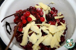В дуршлаг высыпать ягоды и порезанный на кусочки имбирь. -