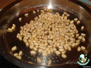 На сухой сковородке обжариваем слегка кедровые орешки и посыпаем салат. -