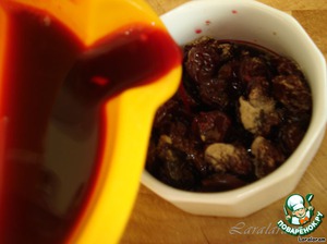 Вишню посыпаем сахаром и заливаем соком (заметьте, если у вас клюква не мороженая, а сухая, то её надо залить соком вместе с вишей).