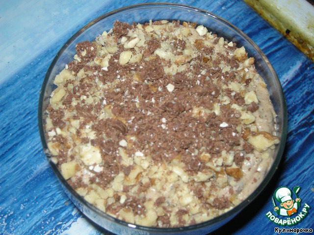 Сверху посыпать дроблеными орехами и тертым шоколадом.