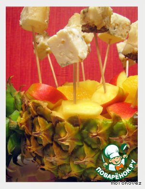 Нарезать сыр кубиками. Насадить кубик сыра на зубочистку и воткнуть в кусочек фрукта.