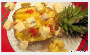 Фуршетный ананас украсит ваш стол и до, и после праздничного ужина! Вы можете придумать любые комбинации, будь то креветки, кубики ветчины, салями, сыра, лишь бы они сочетались с вашим фруктовым салатом...