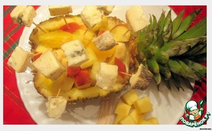 Фуршетный ананас украсит ваш стол и до, и после праздничного ужина! Вы можете придумать любые комбинации, будь то креветки, кубики ветчины, салями, сыра, лишь бы они сочетались с вашим фруктовым салатом...