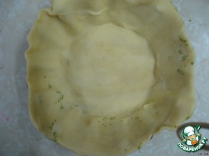 Достаем тесто, раскатываем толщиной 3мм, укладываем в форму. Выкладываем начинку.
