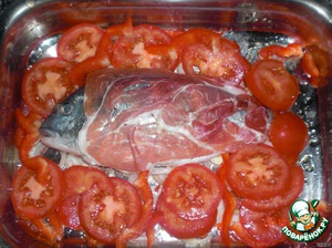 Укладываем сверху очищенную, заранее посоленную рыбу, на ней делаем 2 надреза, туда кладём по паре пластинок чеснока. Вокруг рыбы выложить порезанный кольцами помидор, полу-кольца перца. Всё полить ещё немного оливковым маслом, а рыбку дополнительно лимонным соком.