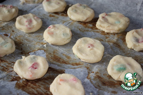 Отрываем от колбаски равные по величине кусочки (резать не надо), делаем шарики, приминаем немного пальцами. Выкладываем на противень с бумагой для выпечки. У меня бумага многоразового использования (с силиконовым покрытием), уже после разных булочек, поэтому фотка не очень приличная!)))))))