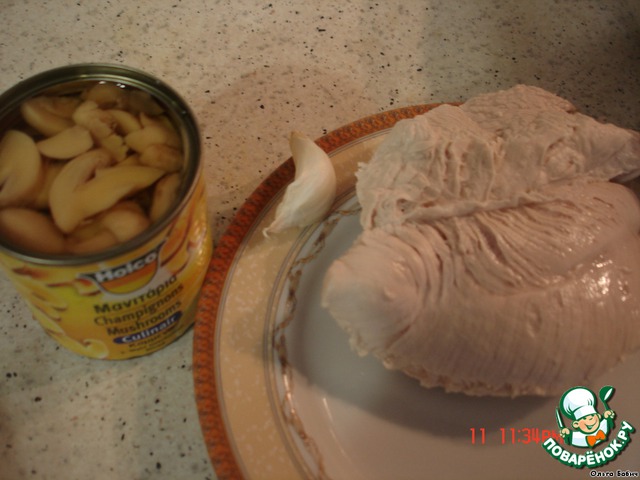 Грудку индюшки и грибы перемолоть на блендере, добавить чеснок и специи |