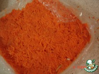 Морковь трем на терке, добавляем чеснок и специи, пассируем с 2 ст.л масла на слабом огне, совсем немного, чтобы морковь сохранила цвет |