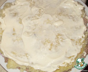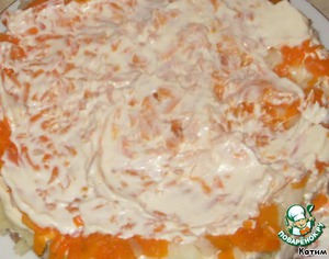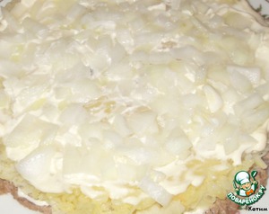 Следующий слой-трем картофель на терке, подсаливаем, смазываем майонезом.