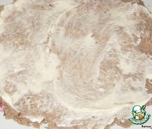 Мясо освобождаем от жилок и т. д. Прокручиваем через мясорубку. Я в комбайне измельчила. Смешиваем полученную массу с 2 ст. л. хрена готового. Выкладываем на блюдо 1 слоем. Смазываем майонезом. Я маловато смазала, надо чуть побольше. Немножко суховато получилось.