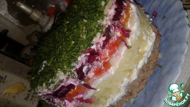 На лук выкладываем слой из тертой моркови, подсаливаем и смазываем майонезом. Затем сверху салат покрываем тертой на крупной терке свеклой, смазываем майонезом, посыпаем тертым сыром и укропом. Салатик надо убрать в холодильник для пропитки как минимум на час.