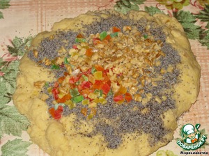 Замесить тесто и добавить измельченные орехи, цукаты и мак.