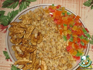 Орехи и цукаты измельчить, а часть орехов оставить целыми для украшения.