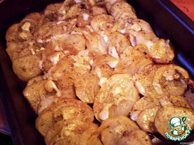 Нарезать картофель и лук кольцами, и уложить на слегка смазанный маслом противень или форму, чередуя слой картошки со слоем лука.