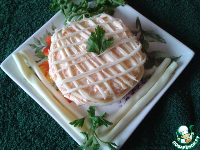 Никого не хочу удивить составом этого остренького салата. А вот кучерявость морковки заслуживает внимания. Ваши гости не сразу поймут, что скрывается под пышной шевелюрой…
