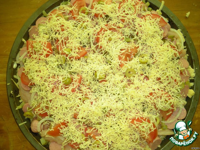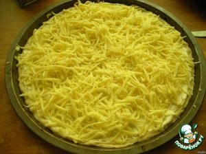 Тесто смазываю майонезом или кетчупом, потом сыр натертый на крупной терке,