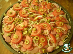на этот "коврик" выкладываем начинку-все, что есть в холодильнике, у меня здесь: куриное филе, сосиски, огурчики соленые, помидоры, лук репчатый, оливки, специи по вкусу, зелень.