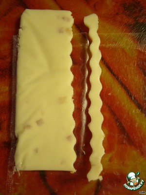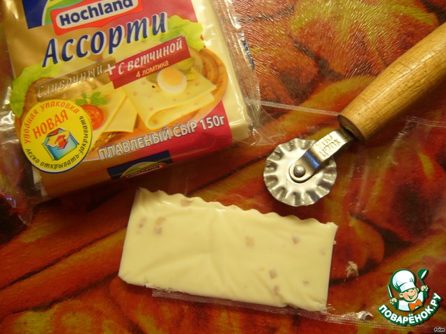 Мне захотелось сделать розетки более нарядными. Из ломтика плавленого сыра я нарезала фигурным ножом (или как он иначе называется???) волнистые кружевные полосочки.