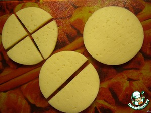 • Сыр нарезать пластинами. Можно вырезать кружки стаканом или формочками, но я просто разделила на 4 части.