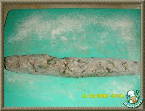 Подпылить мукой доску и выложить половину фарша, немного присыпать мукой и раскатать колбаску желаемого размера.