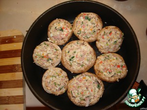 Наполнить подготовленные шляпки грибов фаршем.