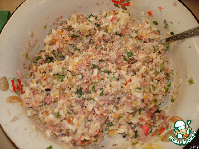 Ножки и остатки грибов, вареные вкрутую яйца, ветчину, крабовые палочки, лук репчатый и зеленый мелко крошим и смазываем майонезом.