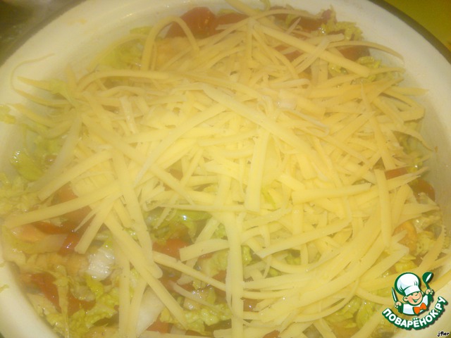 Пока остывает обжаренный перец и филе, шинкуем капусту и нарезаем крупным кубиком помидор. Не забудьте посолить.